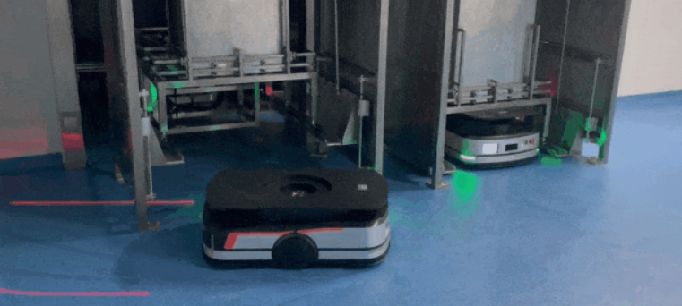 AMR將料車放置到輸送機上,安全空間較窄。