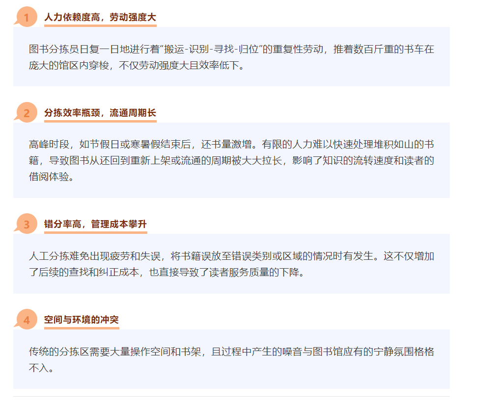 在引入螞蟻機(jī)器人智能分揀解決方案之前,傳統(tǒng)的圖書館運(yùn)營普遍存在以下嚴(yán)峻挑戰(zhàn):